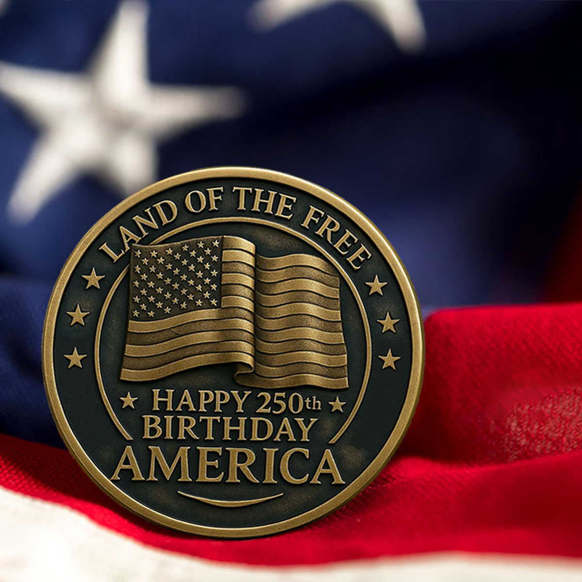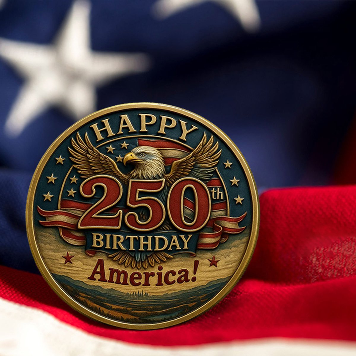 This commemorative challenge coin captures the bold spirit and enduring legacy of the United States. Featuring a majestic bald eagle on one side and a proud waving flag on the other, it honors 250 years of freedom, courage, and unity.