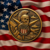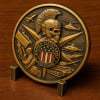 The front side boldly presents a battle-forged warrior skull wearing a modern-Spartan-style helmet, symbolizing the unbroken spirit of the American soldier through time. Surrounding this powerful emblem: